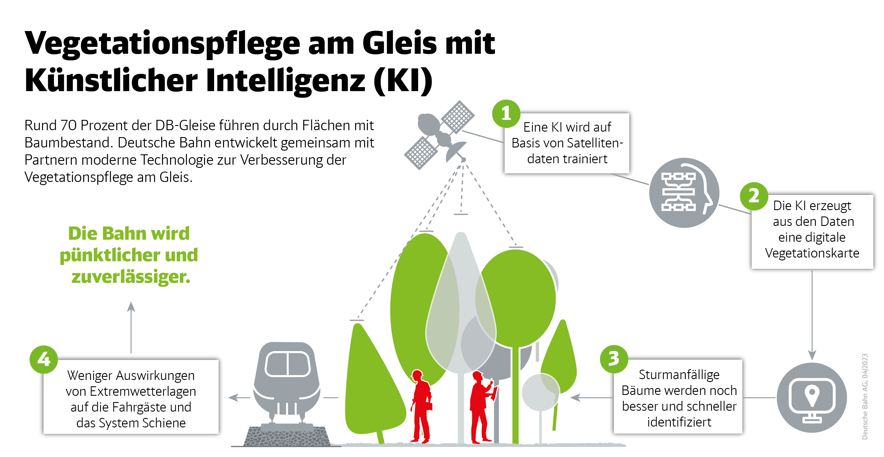 Mit den Daten wird eine digitale Vegetationskarte erstellt, welche die Ressourcenplanung der Vegetationstrupps unterstützt: Durch den Vergleich von Baumhöhe und Abstand zum Gleis lassen sich mögliche Sturzszenarien ableiten. In Verbindung mit den Inspektionsergebnissen der Expert:innen vor Ort können Bäume mit erhöhtem Sturmrisiko für das Schienennetz identifiziert und priorisiert entfernt werden.