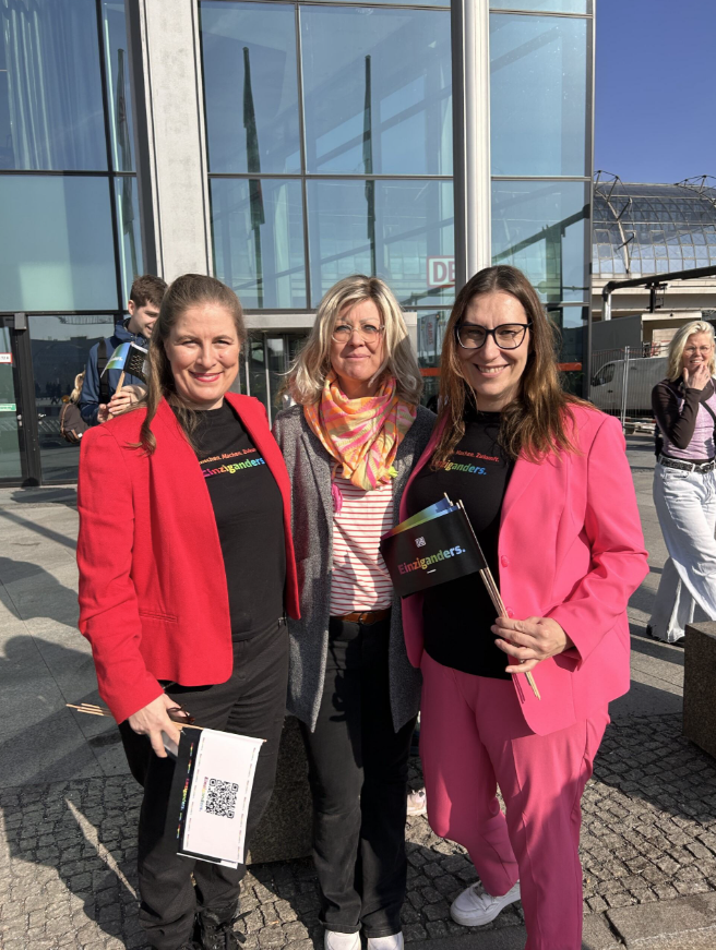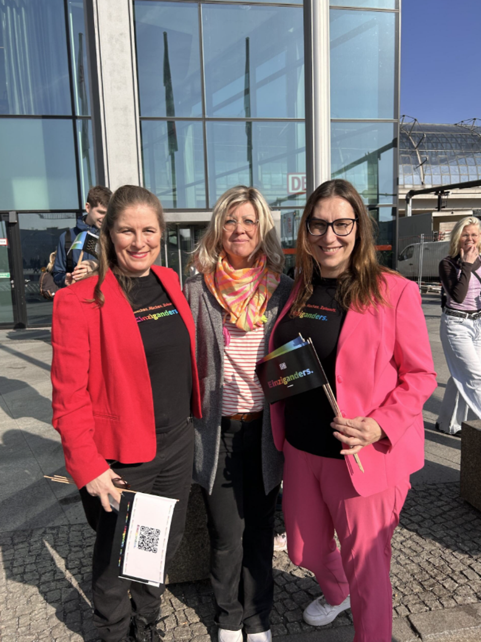„Das Netzwerk Frauen bei der Bahn bringt Frauen zusammen und macht sie sichtbar. Wir möchten eine dauerhafte Gleichstellungskultur und beteiligen uns an der Konkretisierung von Maßnahmen zur Stärkung von Frauen im Konzern. Die Flagge am Berliner Hauptbahnhof steht genau dafür: für Zusammenhalt, Vielfalt und dafür, dass Frauen unsere Branche aktiv mitgestalten.“