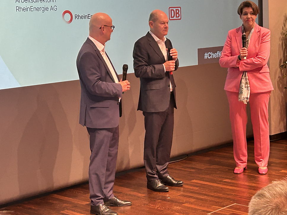 Bundeskanzler Olaf Scholz stellte sich den Fragen des Plenums. Auf die Publikumsfrage, was wir tun können, um die Angst vor der ungewissen KI zu nehmen, antwortete Scholz, dass wir die Angst und das Beeindrucktsein loswerden müssten, ebenso wie den wirtschaftsfeindlichen Populismus.