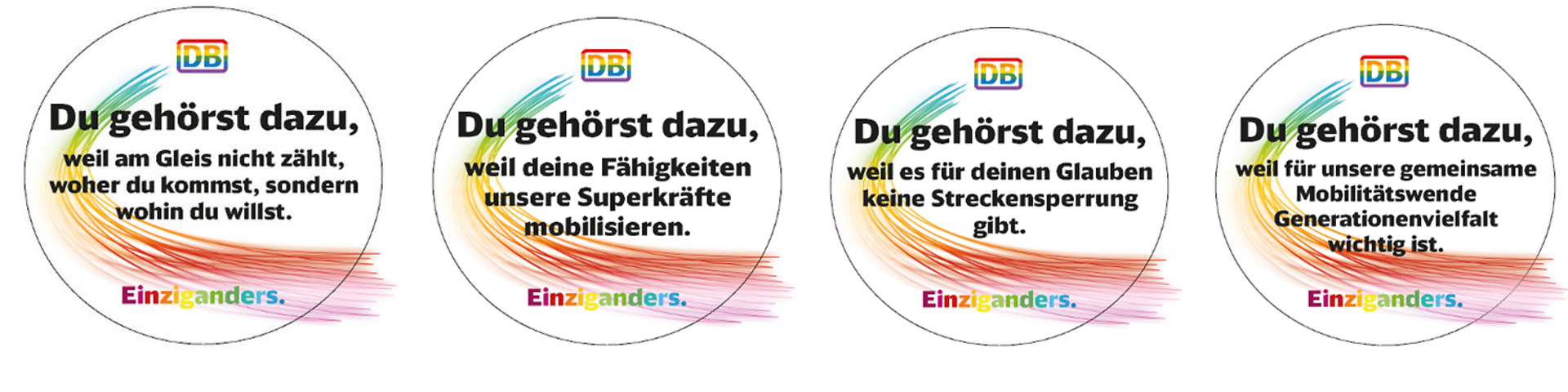 Unter dem diesjährigen Diversity Jahresthema der Deutschen Bahn dreht sich alles um Zugehörigkeit. Schließlich können sich Mitarbeitende in einer diversen Belegschaft nur dann entfalten und wohlfühlen, wenn die Rahmenbedingungen stimmen. Das DB Diversity Management und das DB Personalmarketing rufen mit der Aktion „Du gehörst dazu“ alle Mitarbeitenden dazu auf, über LinkedIn und Instagram ihren individuellen "Du gehörst dazu, weil..."-Post zu teilen. Die Aktion ergänzt die Nutzung von realen Stickern und Buttons, die ab dem 23. Mai von unseren Mitarbeitenden in Zügen, und Bahnhöfen getragen werden. Unter #Einziganders auf LinkedIn werden einige Posts zu finden sein.