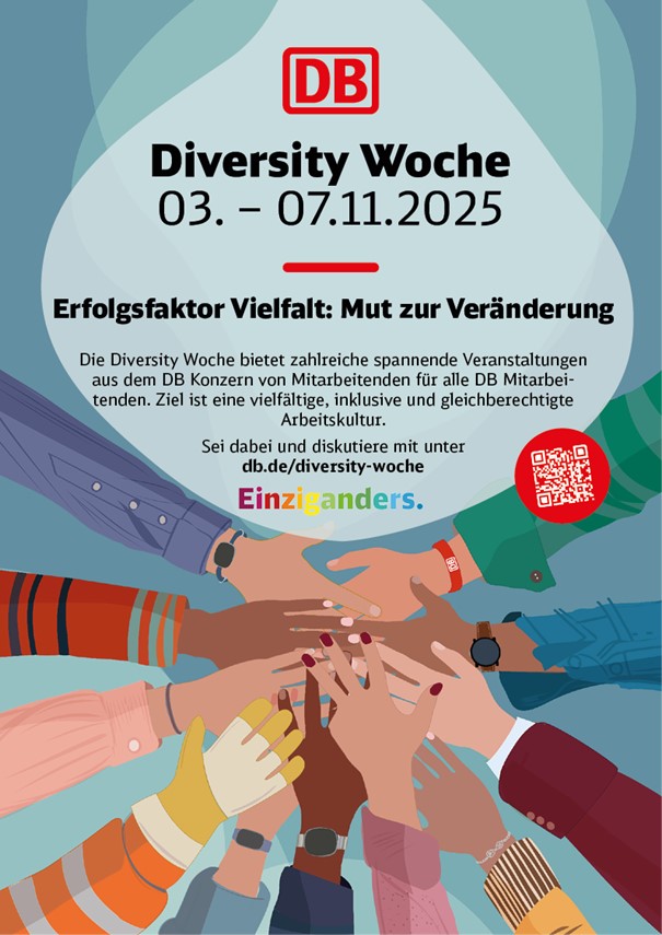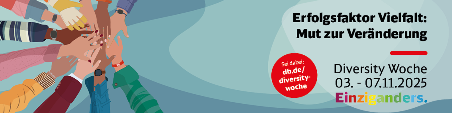 Die Diversity Woche der Deutschen Bahn findet jährlich im November statt und ist ein Angebot, welches sich an alle DB Mitarbeitenden richtet. Dieses Jahr fand sie vom 3. bis 7. November 2025 unter dem Motto „Erfolgsfaktor Vielfalt: Mut zur Veränderung“ statt. Sie ist weit mehr als ein reines Veranstaltungsformat: Diese Woche schafft einen Raum zum Nachdenken, Austauschen und Weiterdenken. Das zentrale Diversity Management und die konzernweite Initiative #Einziganders verfolgen das Ziel, inspirierende Beispiele, gelebte Vielfalt und mutige Impulse für ein offenes Miteinander sichtbar zu machen. Der Erfolg der Woche lebt vom Engagement zahlreicher Fachabteilungen, die Angebote einreichen.