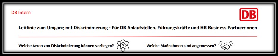 Die Deutsche Bahn steht für Vielfalt, Respekt und Chancengleichheit. Mit der konzernweiten Leitlinie Antidiskriminierung schaffen wir einen verbindlichen Rahmen, um Diskriminierung vorzubeugen, Vorfälle wirksam zu bearbeiten und Betroffene zu schützen – innerhalb unseres Unternehmens und mit Blick auf unsere Verantwortung in der Lieferkette. Die Leitlinie ist ein internes Steuerungsdokument und nicht öffentlich zugänglich; sie prägt jedoch unser Handeln nach innen wie nach außen.