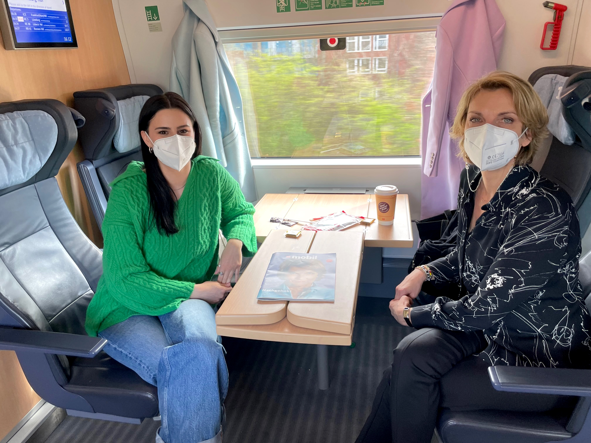 Moderatorin Salwa Houmsi begleitet Marietta Slomka im ICE von Berlin nach Hamburg. An Bord wird sie nicht nur vom Podcast-Team, sondern auch von sich selbst begrüßt. Die Journalistin ist auf dem aktuellen Titel des DB MOBIL Magazins zu sehen, das überall im Zug ausliegt (lesen Sie hier unser Titel-Interview mit ihr). Eine Tatsache, die zuletzt ihre bahnfahrende Mutter sehr freute, wie sie erzählt.