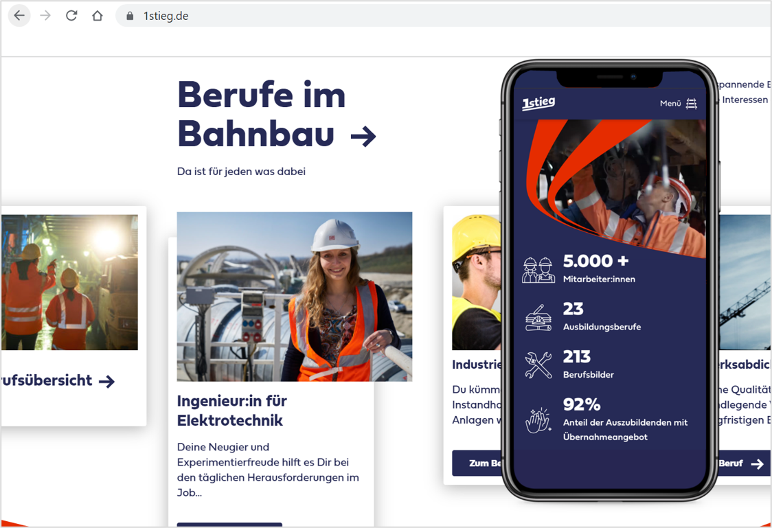 www.1stieg.de gibt Informationen zur Bahnbaubranche, Bahnbauberufen sowie Entwicklungs- und Karrieremöglichkeiten. Ziel ist es, mehr Kandidaten für die Branche zu begeistern und Personalaufbau voranzutreiben.