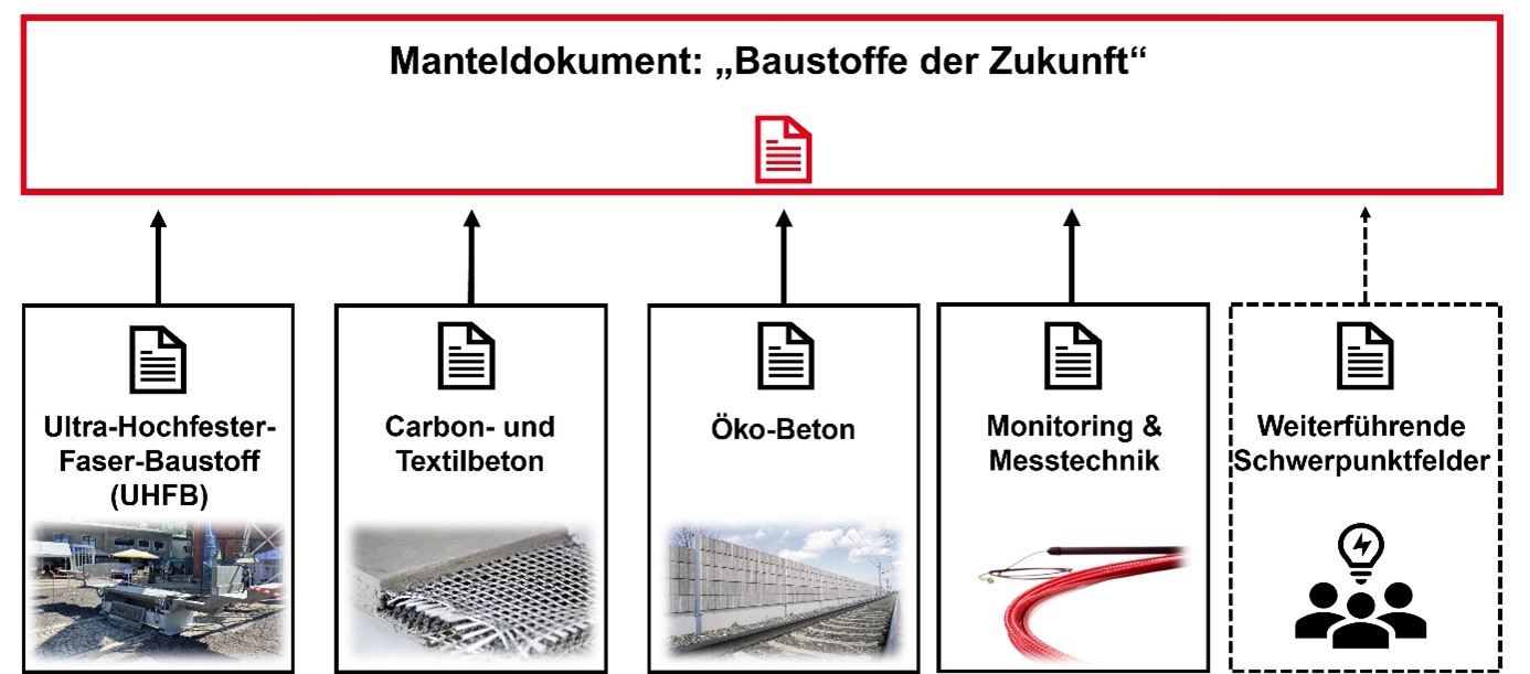 Im Zuge der „Grünen Transformation“ muss auch im Bereich des Bausektors eine Zeitenwende erfolgen. Der Einsatz herkömmlicher Materialien muss in seiner baustofflichen Zusammensetzung und Ausführungsmenge reduziert werden. Neben der materiellen Ebene muss auch die Ausführungsgeschwindigkeit gesteigert werden. Beide Bereiche zahlen positiv auf eine CO2-Reduktion ein. Um dieses Ziel zu erreichen, müssen innovative Baustoffe auch im Bereich der Eisenbahninfrastruktur eingesetzt werden. Dazu wurde die Arbeitsgruppe „Baustoffe der Zukunft“ eingeführt. Hier werden, wie das Schaudiagramm zeigt, anhand eines übergeordneten Manteldokuments die Bereiche aus Ultra-Hochfesten-Faser-Baustoff (UHFB), Textil- und Carbonbeton sowie dem Öko-Beton beleuchtet.
