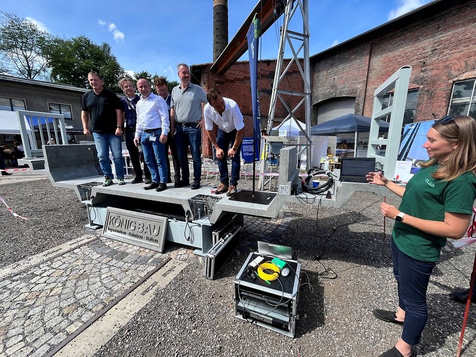Viele dieser Werkstoffe wurden erst im Bereich des Hochbaus entwickelt und finden jetzt den Einsatz im Infrastrukturbereich. Merkmale dieser neuen Werkstoffe sind eine hohe Festigkeit bei gleichzeitiger Querschnittsreduktion, der Einsatz von nichtmetallischer Bewehrung und hohen Frühfestigkeiten im Abbindeprozess. Vorrangig sollen diese Baustoffe im Bereich der Instandhaltung von Bestandsbauwerken im Netz der Bahn eingesetzt werden, um die zukünftige, sichere Weiternutzung der Anlage sicher zu stellen. Die Überlegungen der Verstärkung beim Bauen im Bestand wurden in der Arbeitsgruppe aber auch auf den Sektor des Neubaus fortgeführt. So wurde der erste in Deutschland realisierte UHFB-Verbund-Bahnbrückenquerschnitt als Demonstrator konzipiert und im Zuge der Chemnitzer Eisenbahntage ausgestellt. Teilnehmer der Veranstaltung haben die Stabilität als veränderliche Last getestet und wollten Verformungen hervorrufen, um ein Signal von den Faseroptischen-Sensoren zu erzeugen, siehe Abbildung.