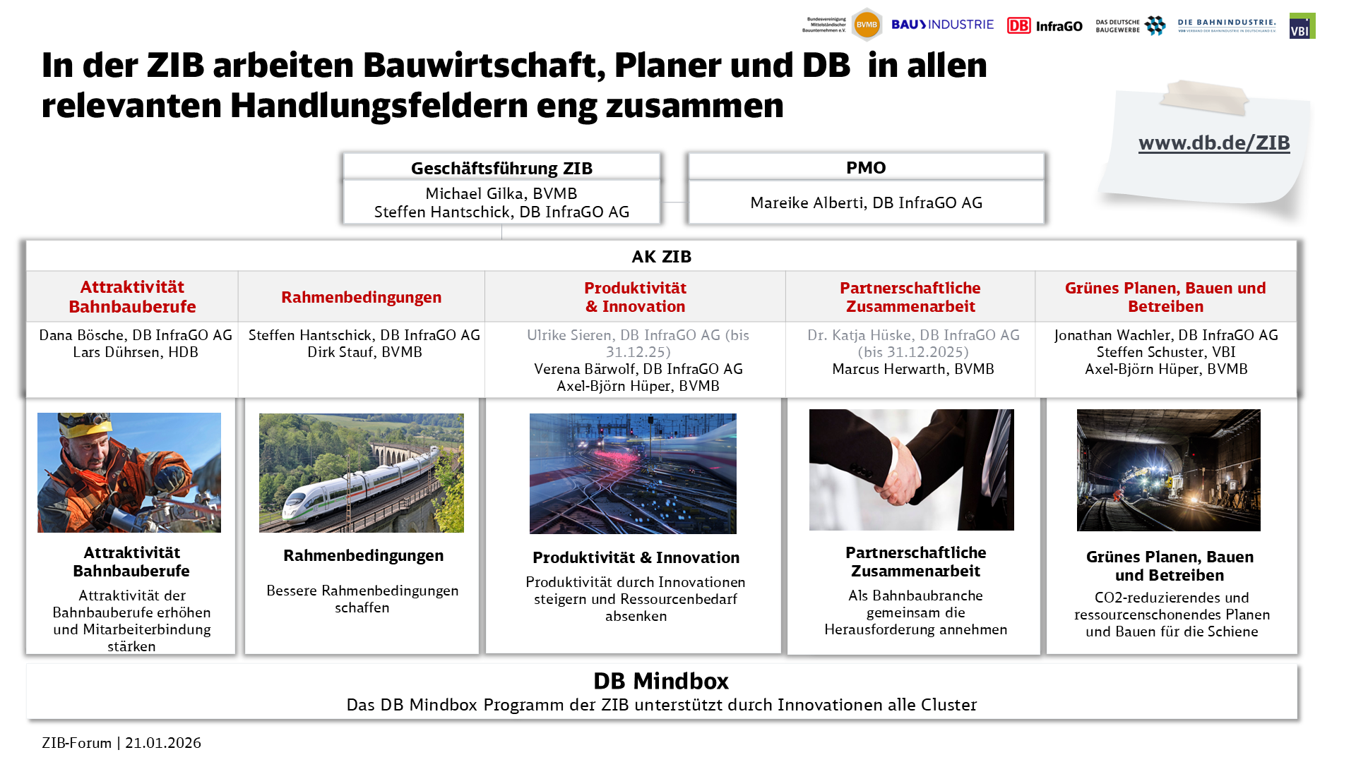 Zu Beginn gab Steffen Hantschick einen Überblick über die ZIB und ihre verschiedenen Cluster, die die zentralen Handlungsfelder der ZIB abbilden. In der ZIB arbeiten Bauwirtschaft, Planer und DB in allen relevanten Bereichen eng zusammen, um praxisnahe Lösungen zu entwickeln.
