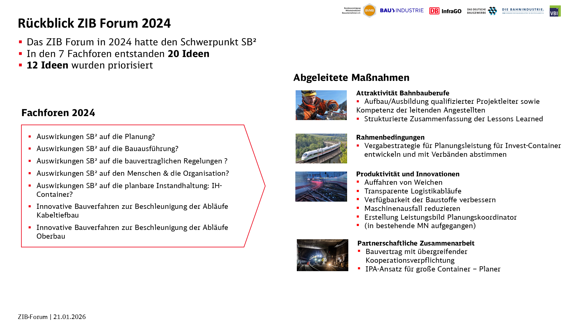 Anschließend blickte Michael Gilka auf das letzte ZIB-Forum 2024 zurück. Dieses Forum stand im Zeichen von SB² und behandelte verschiedene Schwerpunkte in den Fachforen. Aus den Diskussionen entstanden insgesamt 20 Ideen, von denen 12 priorisiert und in konkrete Maßnahmen überführt wurden. Einige dieser Maßnahmen stellten Michael Gilka und Steffen Hantschick den Teilnehmenden vor. Alle Ergebnisse und Maßnahmen der ZIB sind zudem auf der ZIB-Webseite einsehbar.