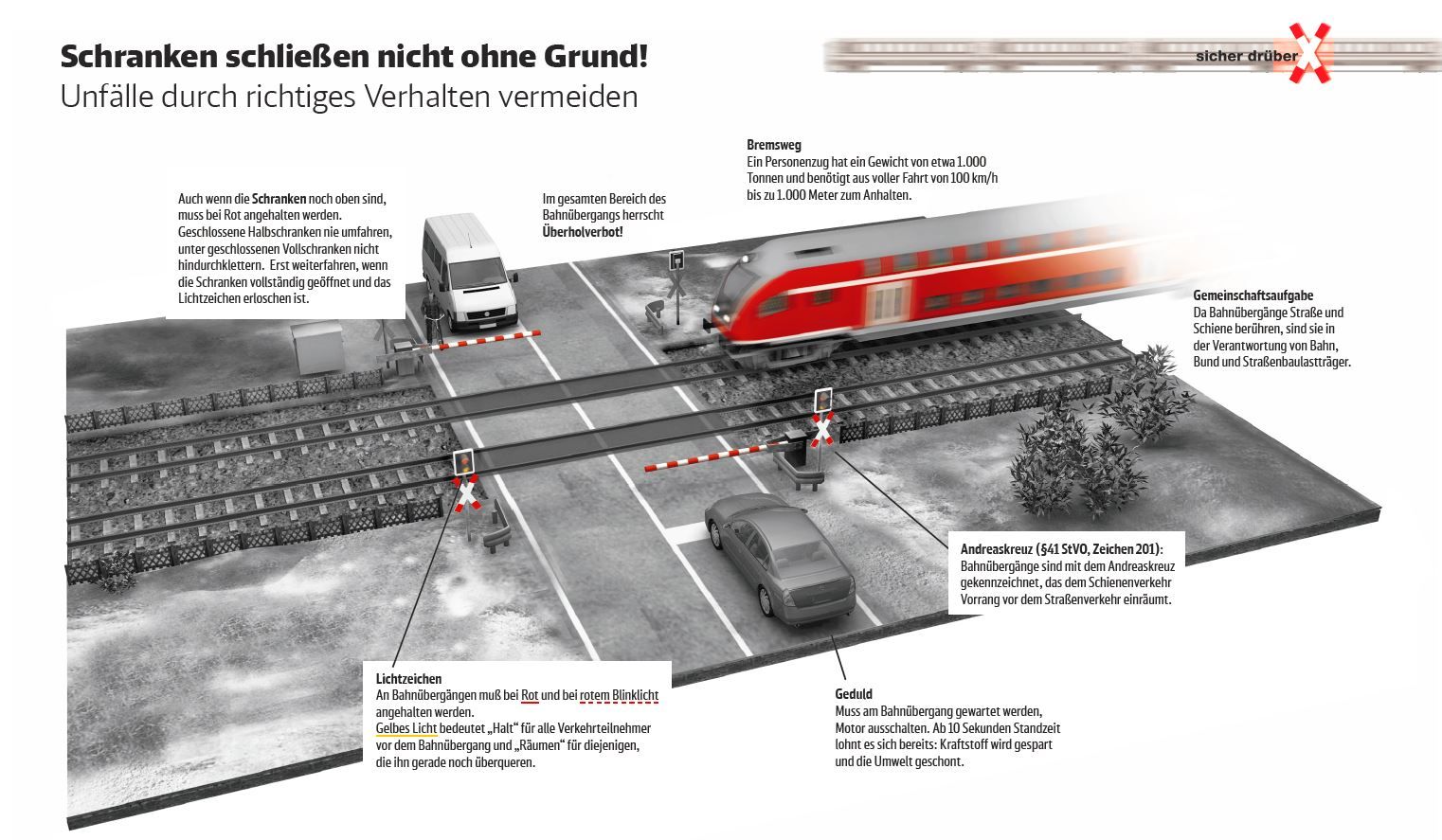 - Geschlossene Voll- oder Halbschranken niemals umfahren oder darüber klettern.