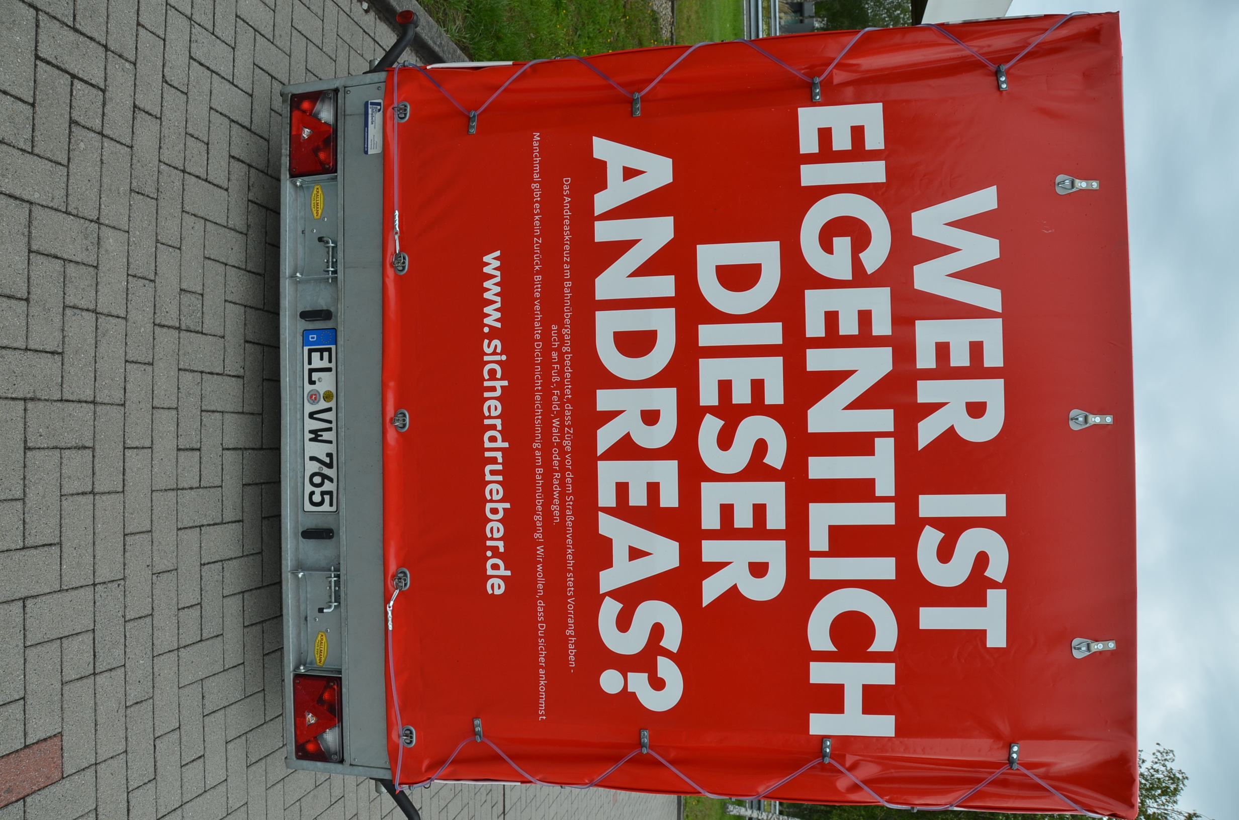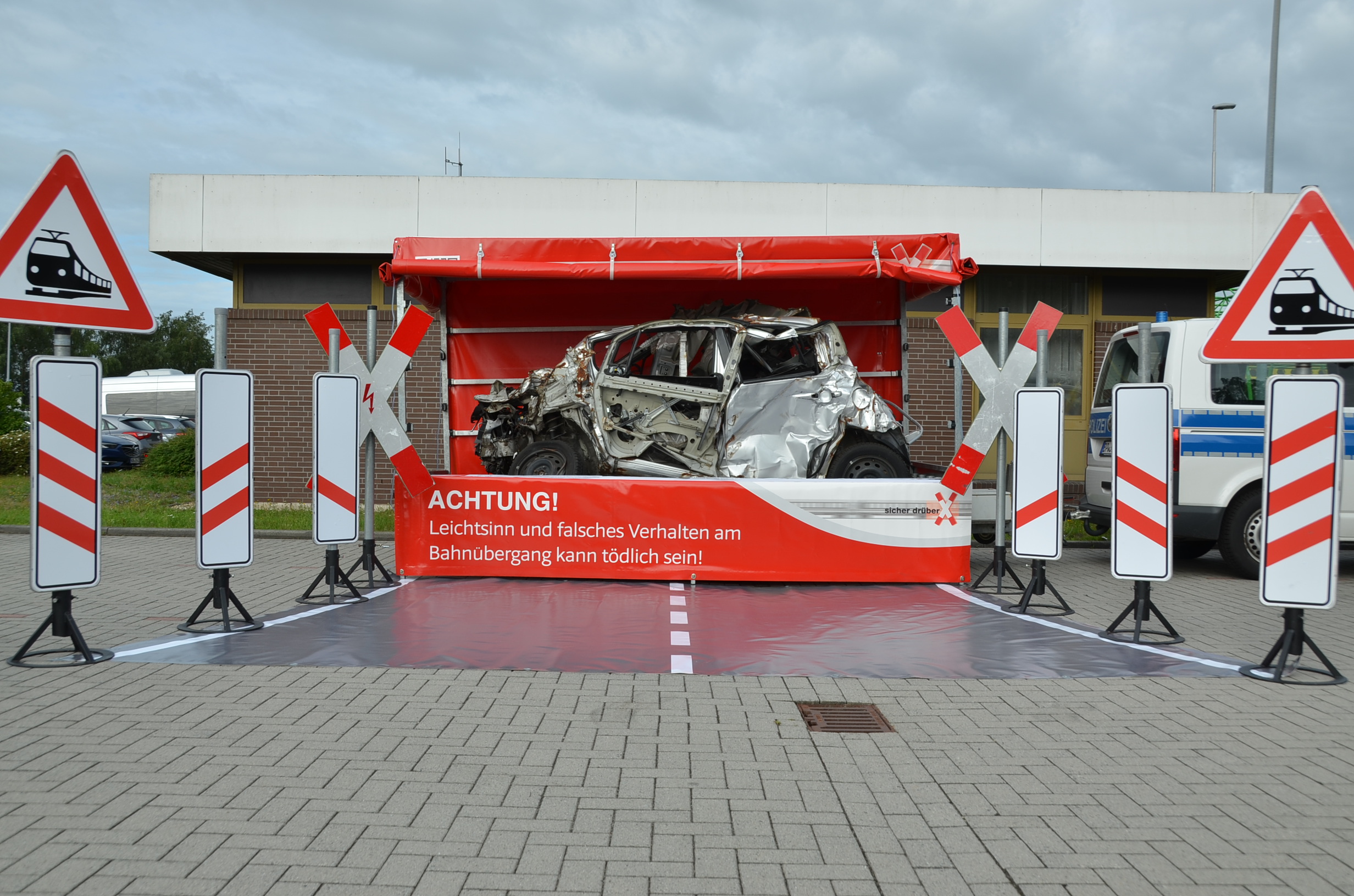 Seit 2016 setzen die Partner:innen von „sicher drüber“ bewusst auch auf den Schockeffekt. Ein völlig zerstörtes Auto macht bei Vor-Ort-Terminen in ganz Deutschland auf die dramatischen Folgen von Leichtsinn und Unachtsamkeit am Bahnübergang aufmerksam. Mittlerweile ist ein weiteres Fahrzeug hinzugekommen.