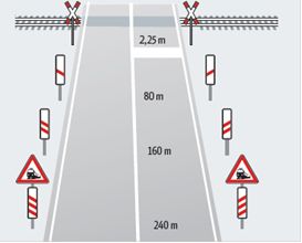 Ein Bahnübergang wird im Vorfeld mit speziellen Verkehrsschildern angekündigt. Das Andreaskreuz bedeutet, dass Züge am Bahnübergang absolute Vorfahrt haben. Der Abstand zum Bahnübergang ist durch Baken gekennzeichnet. Sie stehen in 240 Meter (3 Streifen), 160 Meter (2 Streifen) und 80 Meter (1 Streifen) Entfernung - oft in Verbindung mit Schildern zur Begrenzung der Geschwindigkeit.