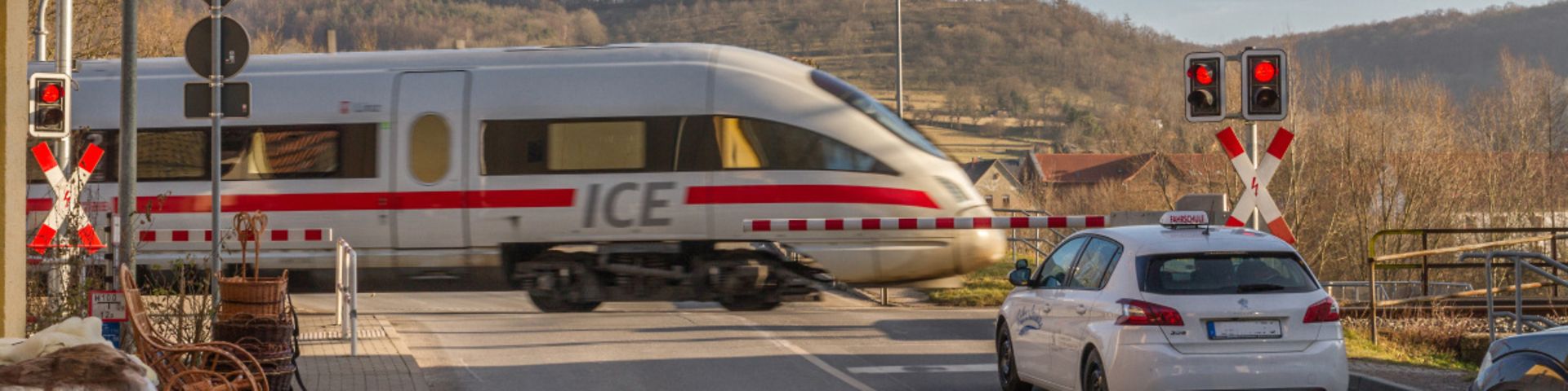 - Nähere Dich dem Bahnübergang langsam und sei bremsbereit! Weiße Baken mit roten Streifen zeigen Dir an, wie weit der Bahnübergang noch entfernt ist.