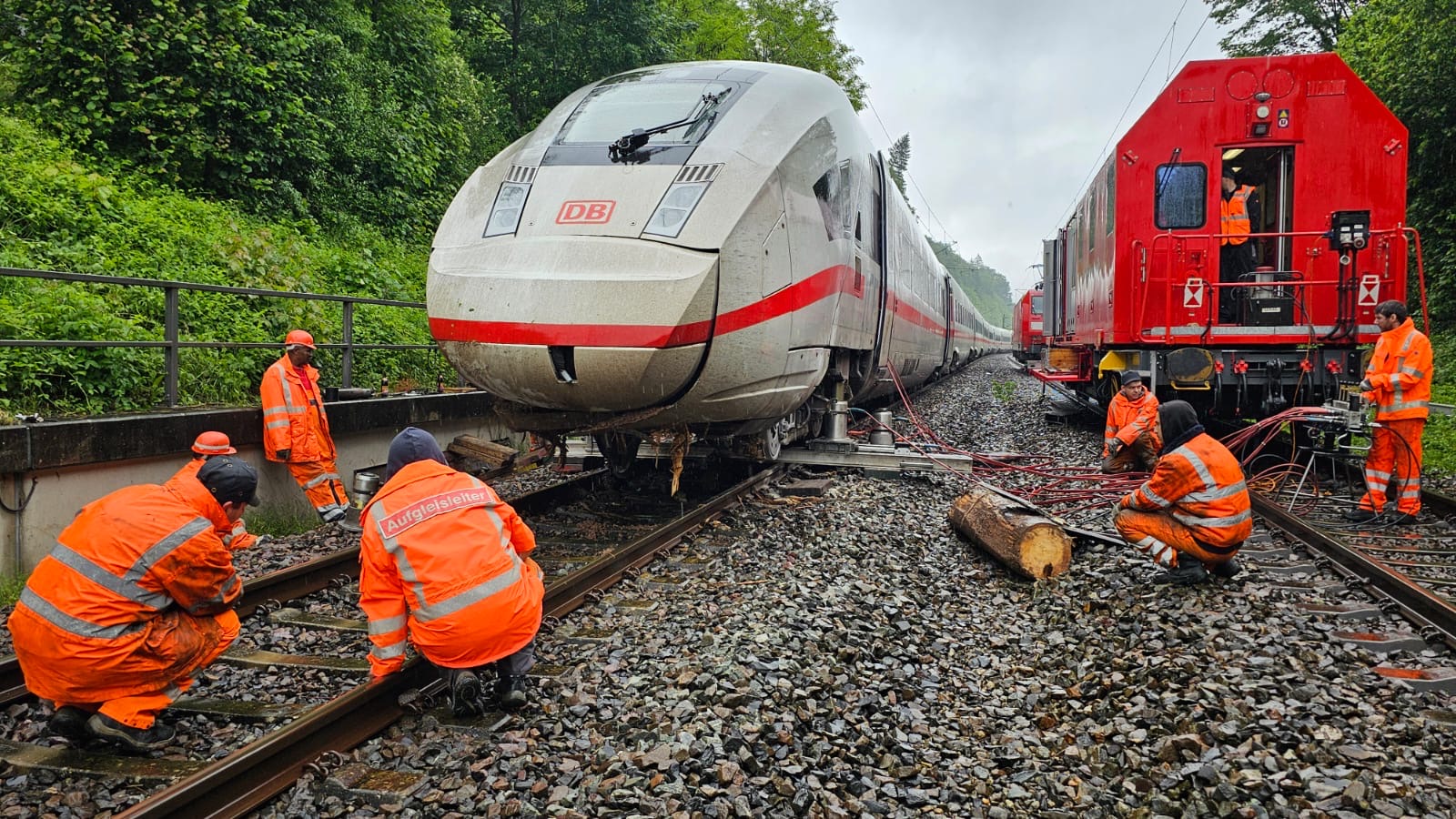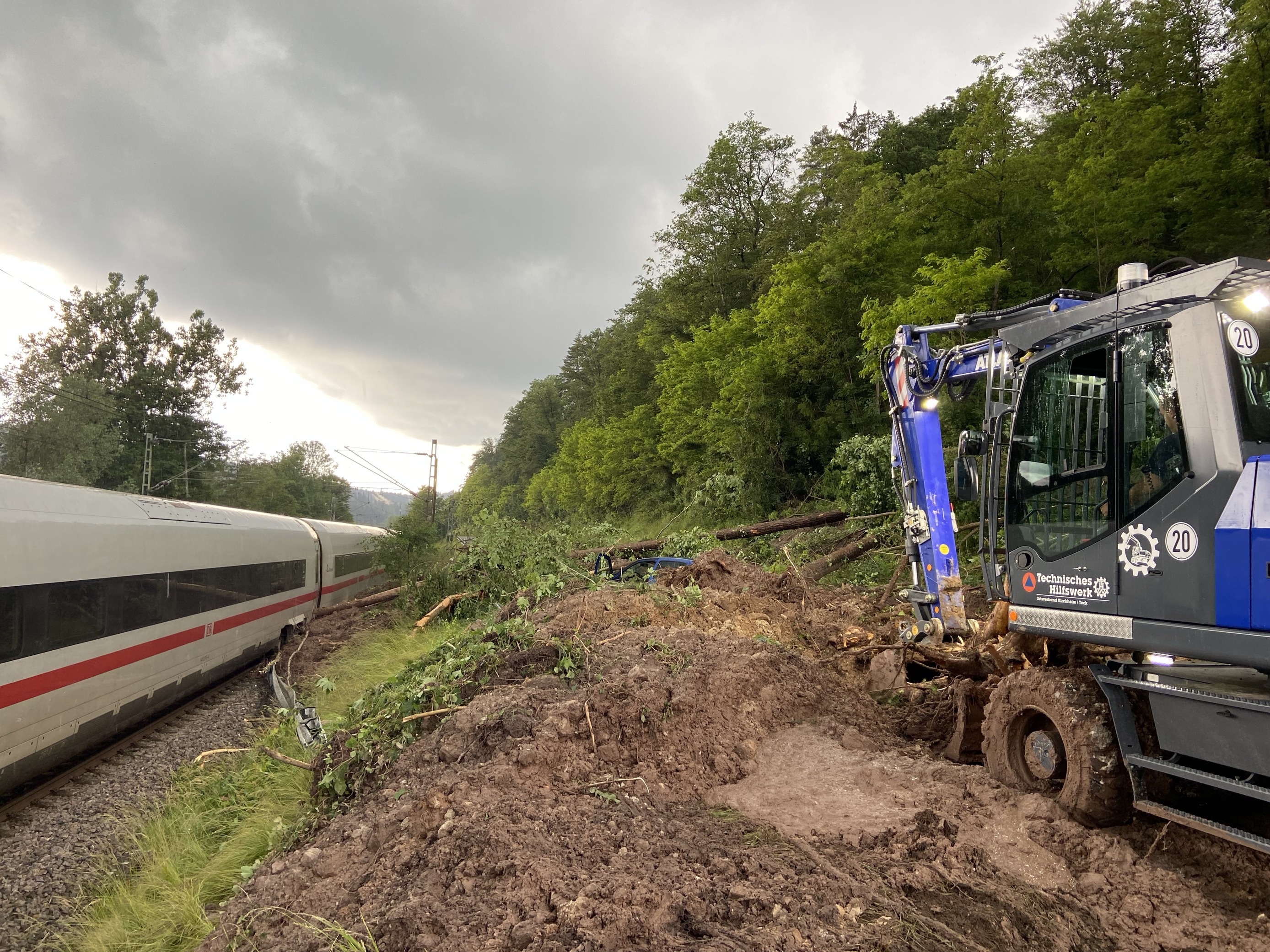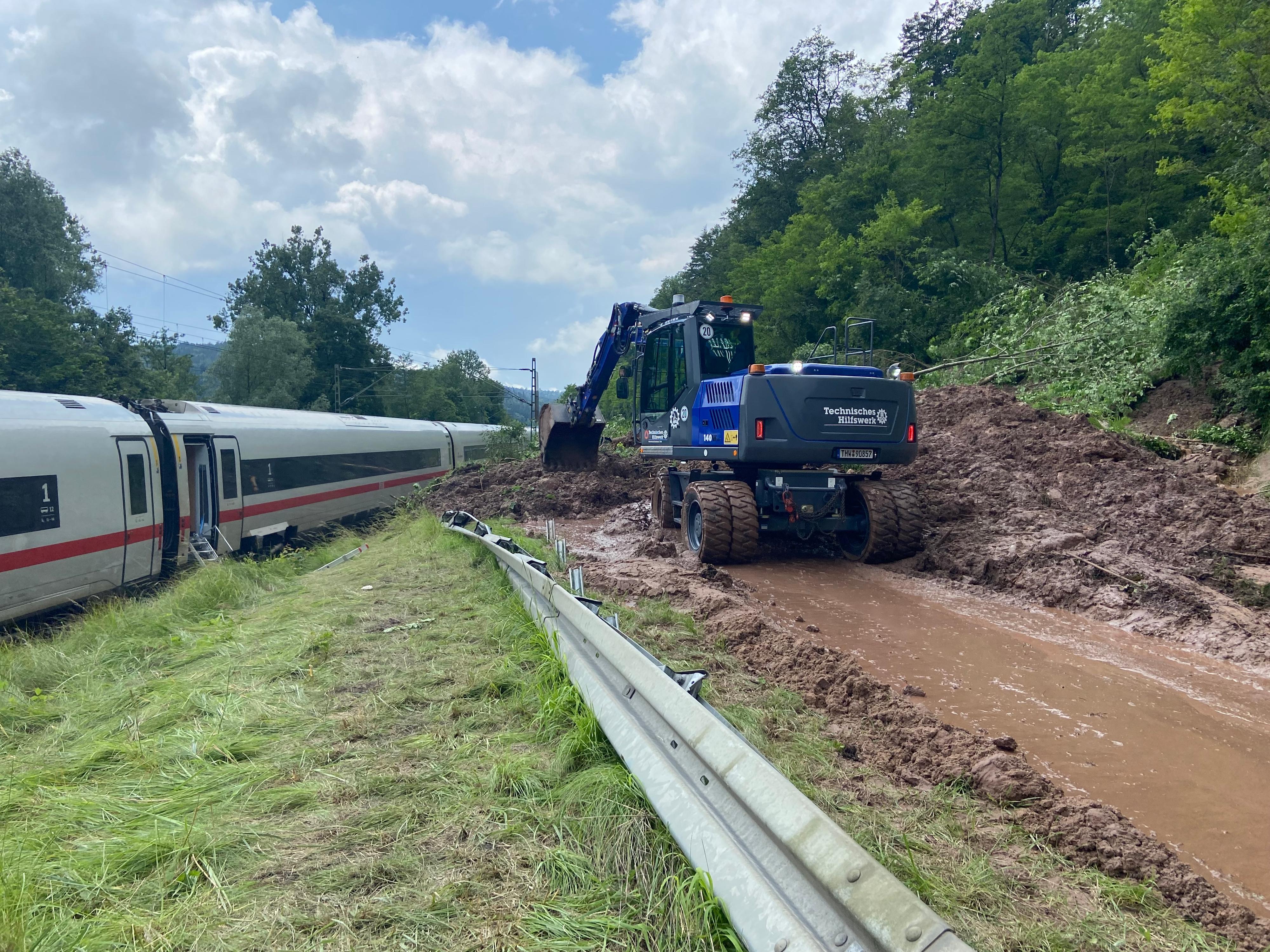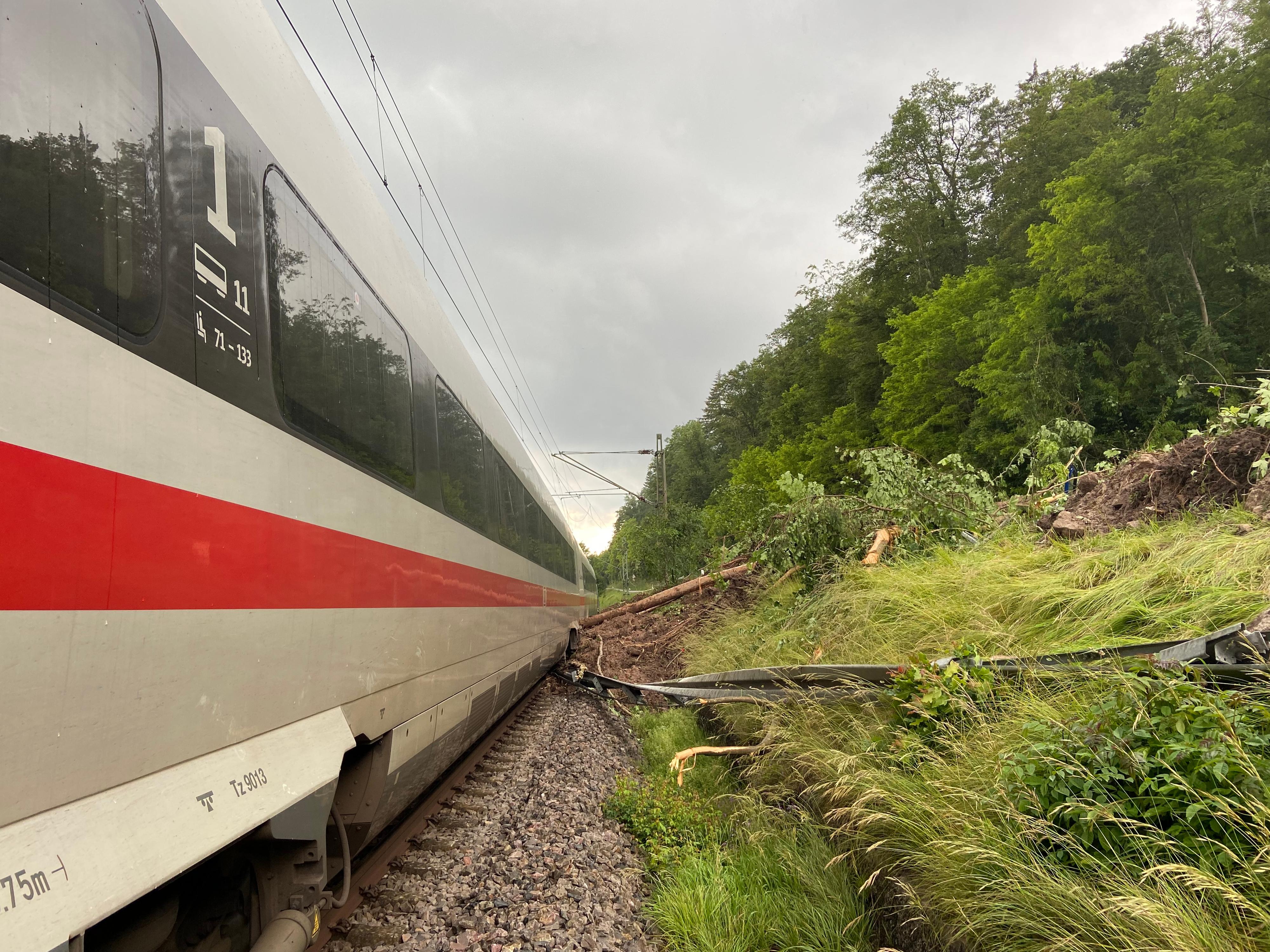 Update: Die Aufgleisung des ICE auf der Strecke zwischen Schwäbisch-Gmünd und Lorch ist mittlerweile erfolgt und der Abschnitt kann wieder eingleisig befahren werden. Der Fernverkehr fährt nach starken Regenfällen wieder vereinzelt zwischen München und Stuttgart. Der Regionalverkehr zwischen Aalen und Stuttgart läuft ebenfalls wieder an. Reisende müssen aber weiterhin mit Ausfällen und Verspätungen rechnen. Auch in vielen anderen Teilen Süddeutschland kommt es zu erheblichen Einschränkungen. Wir bitten die Fahrgäste, sich vor Fahrtantritt im DB Navigator oder auf bahn.de/aktuell zu informieren. In der Nacht zum Sonntag ist der ICE 510 auf dem Weg von München nach Köln bei Schwäbisch-Gmünd auf einen Erdrutsch aufgefahren. Dabei sind zwei Wagons aus den Gleisen gesprungen. Verletzt wurde niemand. Die Fahrgäste im ICE konnten ihre Fahrt mit Bussen fortsetzen.Spezialkräfte der DB konnten am Sonntag die Gleise von umgefallenen Bäumen und Erdmassen befreien und den Zug wieder aufgleisen. Im Laufe des Montags soll der ICE abtransportiert werden. Die DB bedankt sich ausdrücklich bei allen Einsatzkräften für die sehr gute Zusammenarbeit vor Ort. Ein Gutachter prüft derzeit die Stabilität des betroffenen Hangs, erst dann entscheidet sich, wann die Strecke Schwäbisch-Gmünd-Lorch wieder freigegeben werden kann.