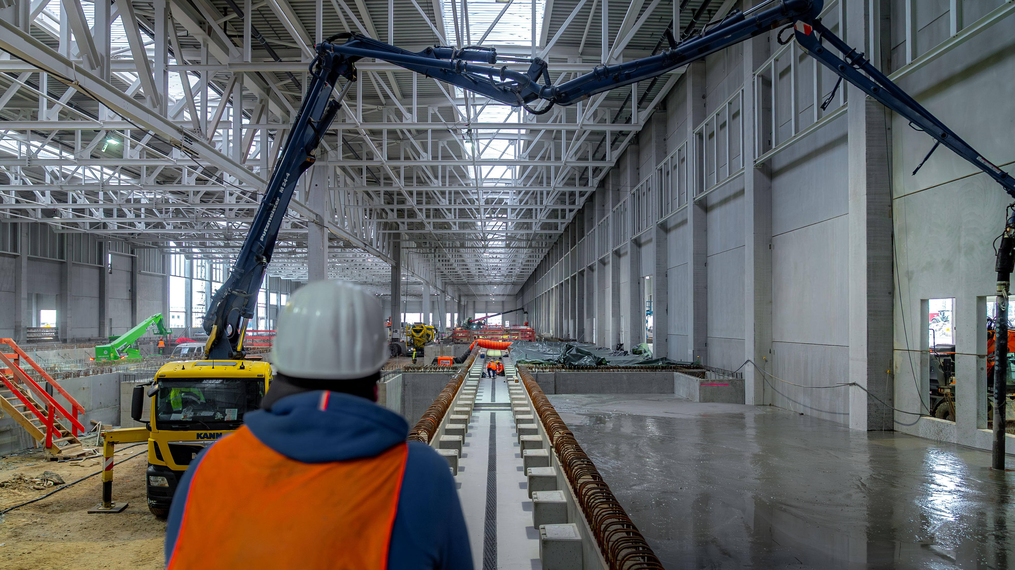 Aktueller Baufortschritt Halle 1: Seit dem symbolischen Spatenstich im März 2024 ist die Werkshalle in einem Rekordtempo in die Höhe und Breite gewachsen. Insgesamt wurden mehr als 400 Stützen aufgestellt. Jede Stütze ist etwa 17 Meter hoch und rund 37 Tonnen schwer.