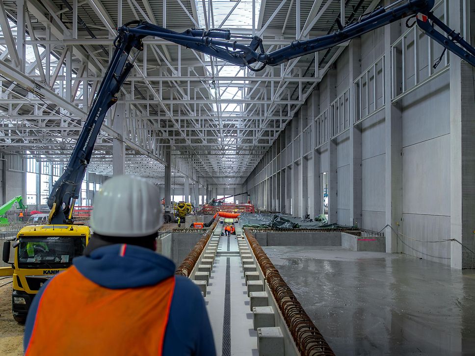 Die Bauarbeiten für die Halle 1 des neuen ICE-Instandhaltungswerks der Deutschen Bahn in Cottbus laufen auf Hochtouren. Ende 2026 steht die bauliche Fertigstellung der über 500 Meter langen Halle an. Der erste Revisionszug soll planmäßig nach Ablauf des Testbetriebs im Februar 2027 in die Halle 1 einfahren. „Es beginnen die letzten zwölf Monate der Bauzeit“, sagte Gesamtprojektleiter, Carsten Burmeister, bei einem Rundgang auf dem Gelände. „Wir werden die Halle planmäßig fertigstellen. Alle Projektbeteiligten aus dem Team DB und der Allianz sowie unsere Nachunternehmer auf der Baustelle erbringen tagtäglich echte Höchstleistung. Der Bau ist auch ein Kraftakt für die Anwohnenden. Für ihre Geduld und ihr Verständnis bin ich ihnen sehr dankbar."
