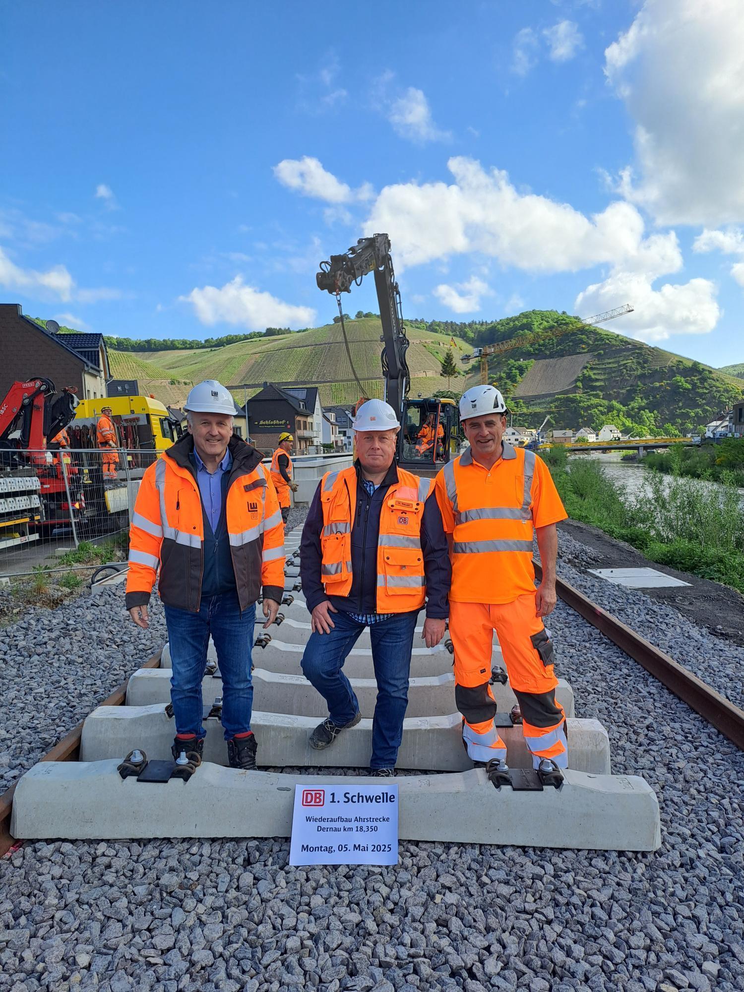Am Bahnkilometer 18,350 in Dernau wurde heute die erste Schwelle für den Wiederaufbau der Ahrstrecke verlegt – ein wichtiger Meilenstein und zugleich der offizielle Startschuss für die anstehenden Gleisbauarbeiten.
