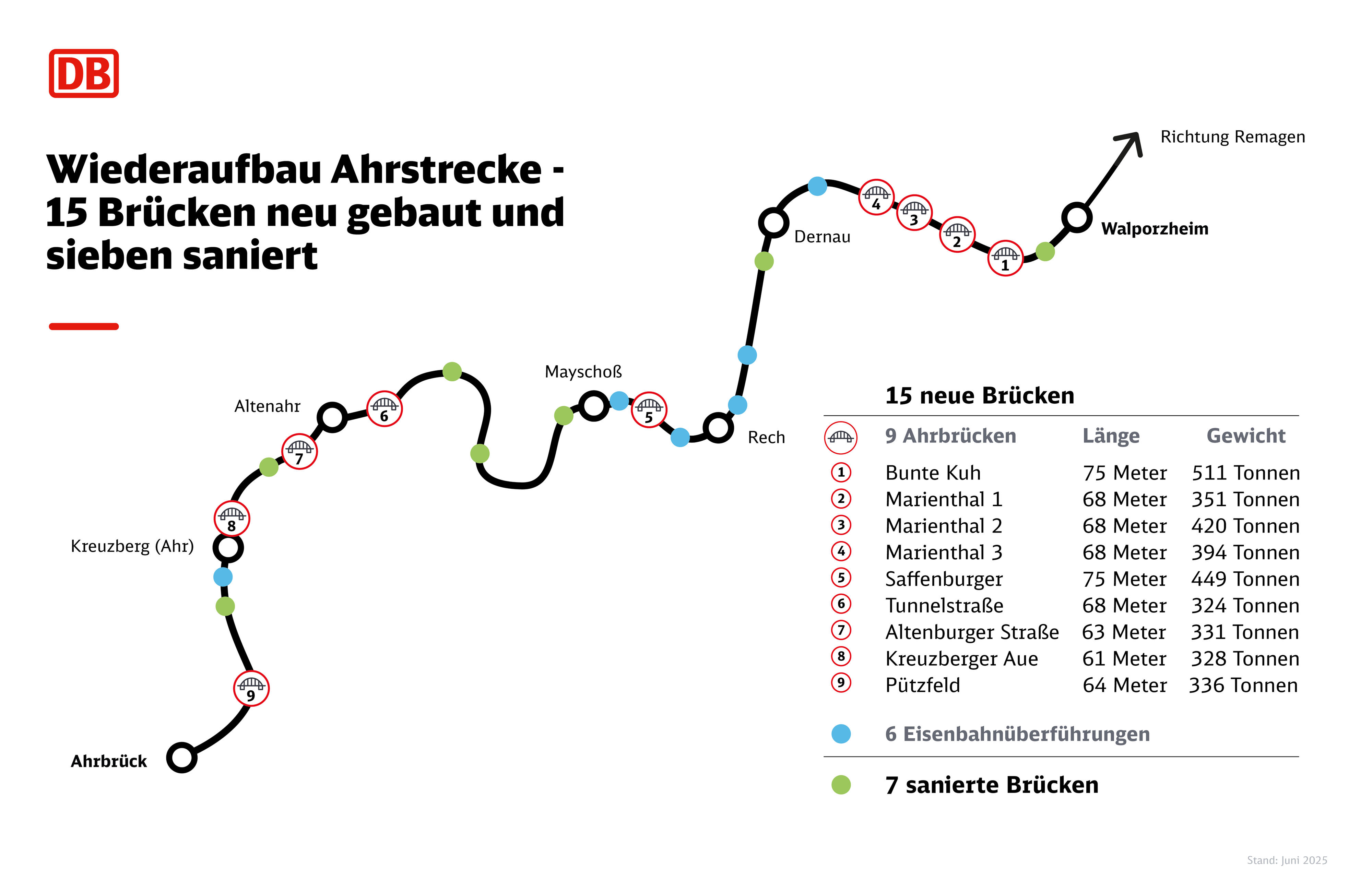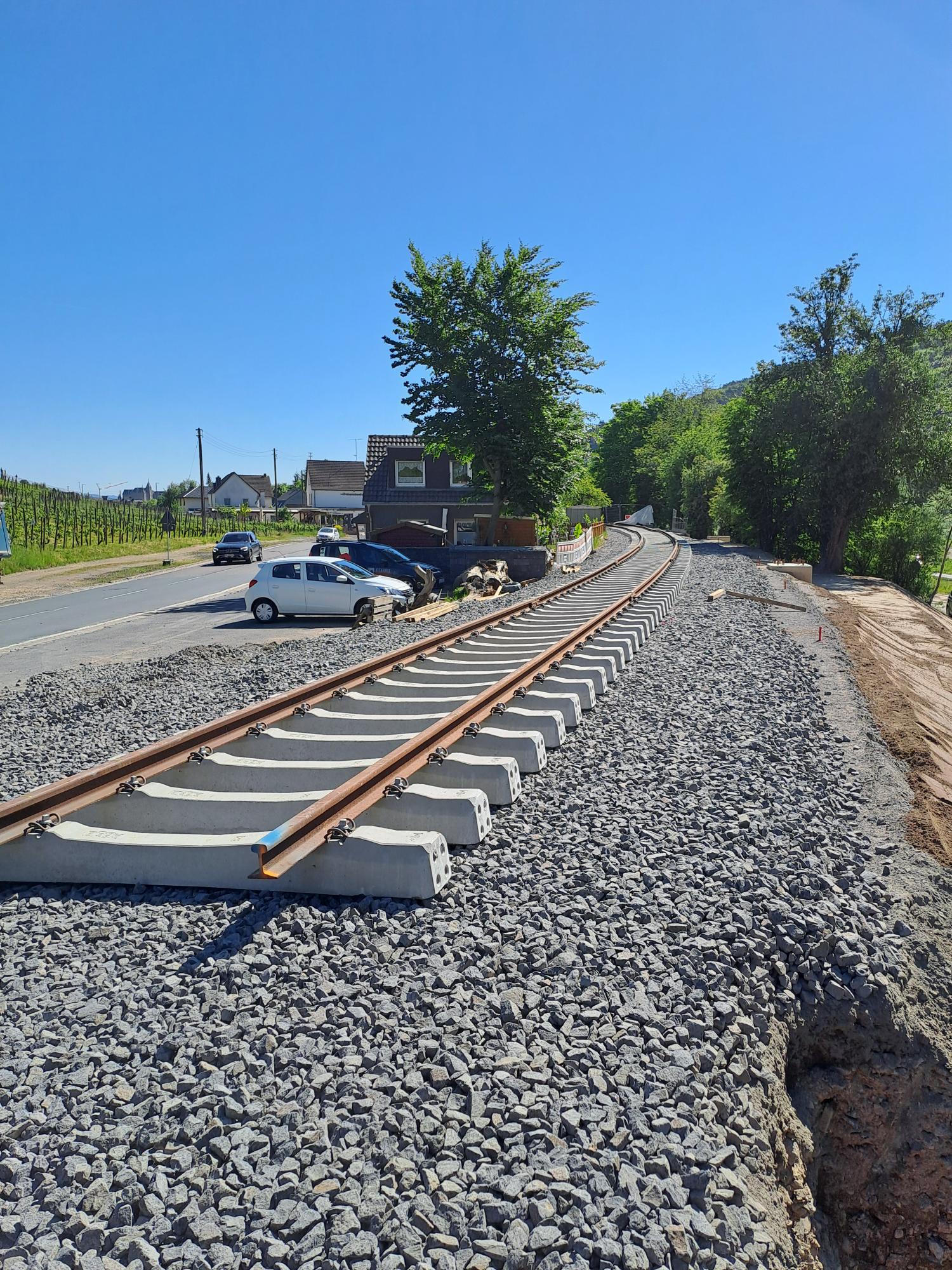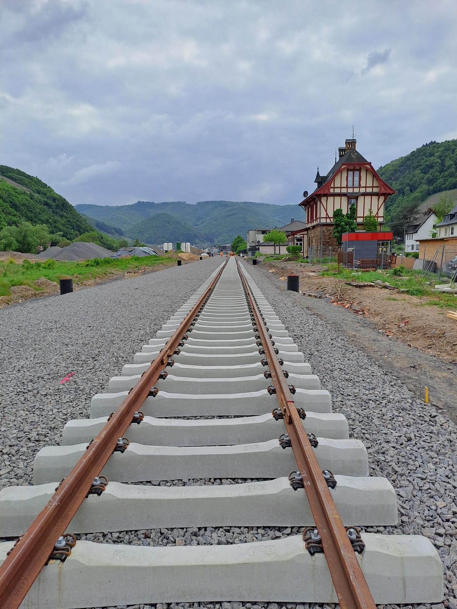 Mit dem Einbau der Schwellen entsteht die bauliche Grundlage für den Oberbau. In den kommenden Monaten werden abschnittsweise rund 28.000 Schwellen, 36.000 Meter Schienen sowie etwa 60.000 Tonnen Schotter eingebaut. Ergänzt wird der Ausbau durch sechs Weichen an den Bahnhöfen Dernau, Altenahr und Kreuzberg. Die Gleisarbeiten sollen voraussichtlich bis September 2025 abgeschlossen sein.