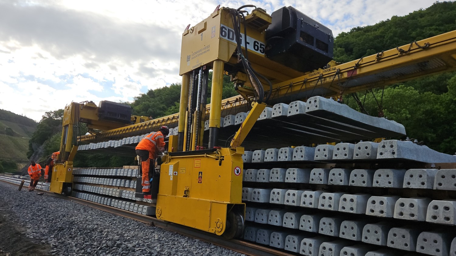 Die Maschinentechnik „Donelli“ von LEONHARD WEISS geht einher mit hohen Leistungen von bis zu 250 Metern pro Stunde beim Gleisvorbau, Schwellenverlegen und Jochwechsel auch bei Bogenradien kleiner 250 Metern. Der Donelli ist bis Ende Juli zwischen Dernau und Kreuzberg entlang der Strecke im Einsatz.
