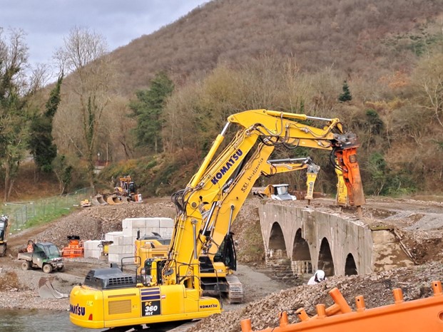 Die alte Eisenbahnbrücke "Pützfeld" zwischen Kreuzberg und Ahrbrück ist seit 27.11.24 um 15 Uhr Geschichte. Damit ist das Bauwerk nicht nur die am weitesten im Tal gelegene Brücke, sondern auch die letzte die nun abgerissen wurde. Um die Einschränkungen für den Durchfluss der Ahr so gering wie möglich zu halten, orchestrierte das Bauteam einen schnellen Abriss. Mit gleich vier Baggern gleichzeitig wurden die Abbruchteile ins vorbereitete Fallbett gebracht. Die Arbeiten zum Neubau der Brücke starten im Januar 2025.