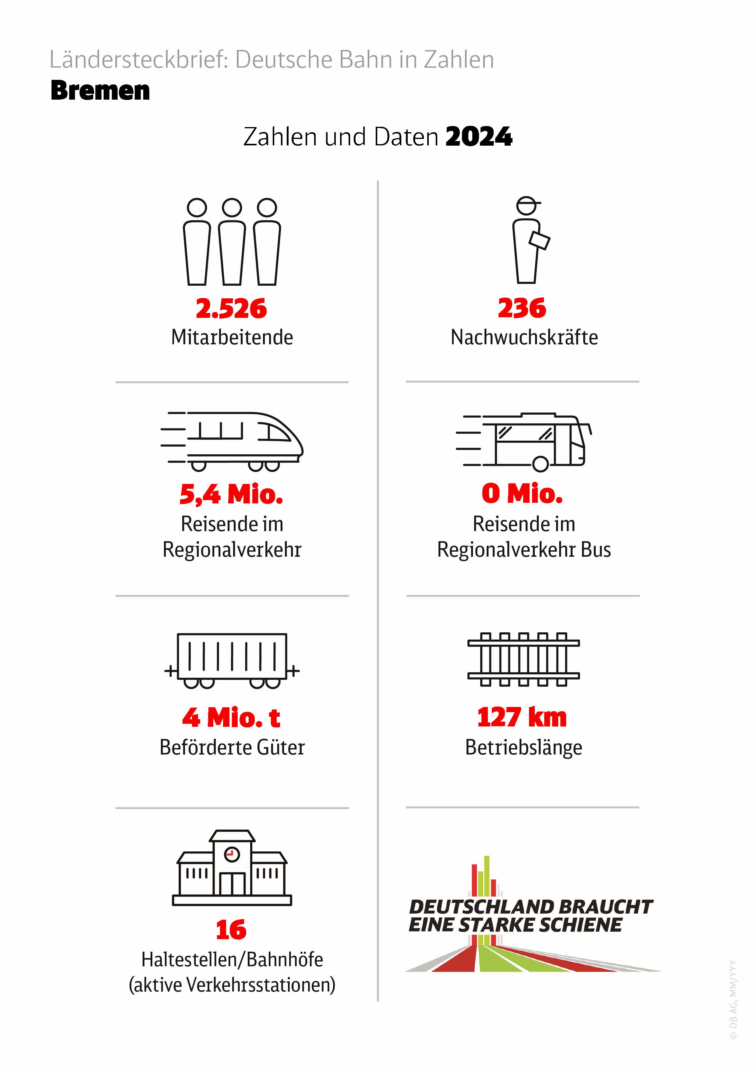 Artikel: Die Deutsche Bahn in Bremen Zahlen, Daten und Fakten Stand: Juli 2025Die Deutsche Bahn (DB) beschäftigt in Bremen über 2.500 Mitarbeitende. Sie ist damit einer der größten Arbeitgeber und sichert durch ein hohes Auftragsvolumen einige tausend weitere Arbeitsplätze in der Region. Quelle: DB AG