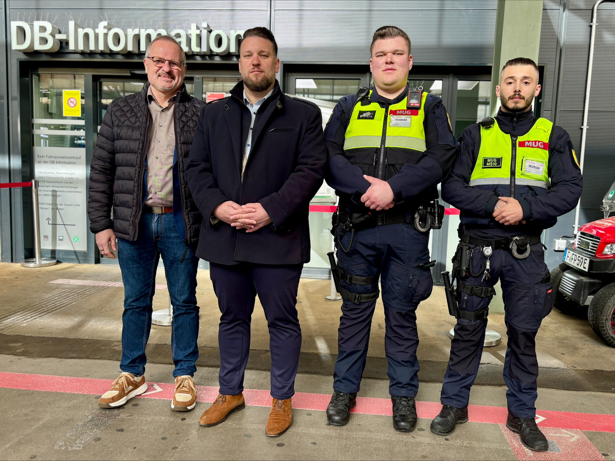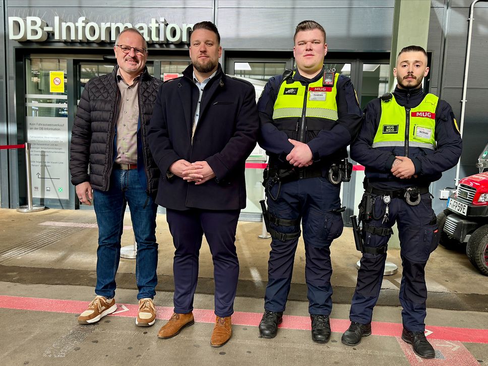 v.l.n.r. Michael Groh, Leiter Personenbahnhöfe Region Südwest, DB InfraGO AG, Stephan Schmidt, Leiter Regionalbereich Südwest der DB Sicherheit sowie Tim und Nando von der DB Sicherheit (Deutsche Bahn AG / Carmen Göbel)