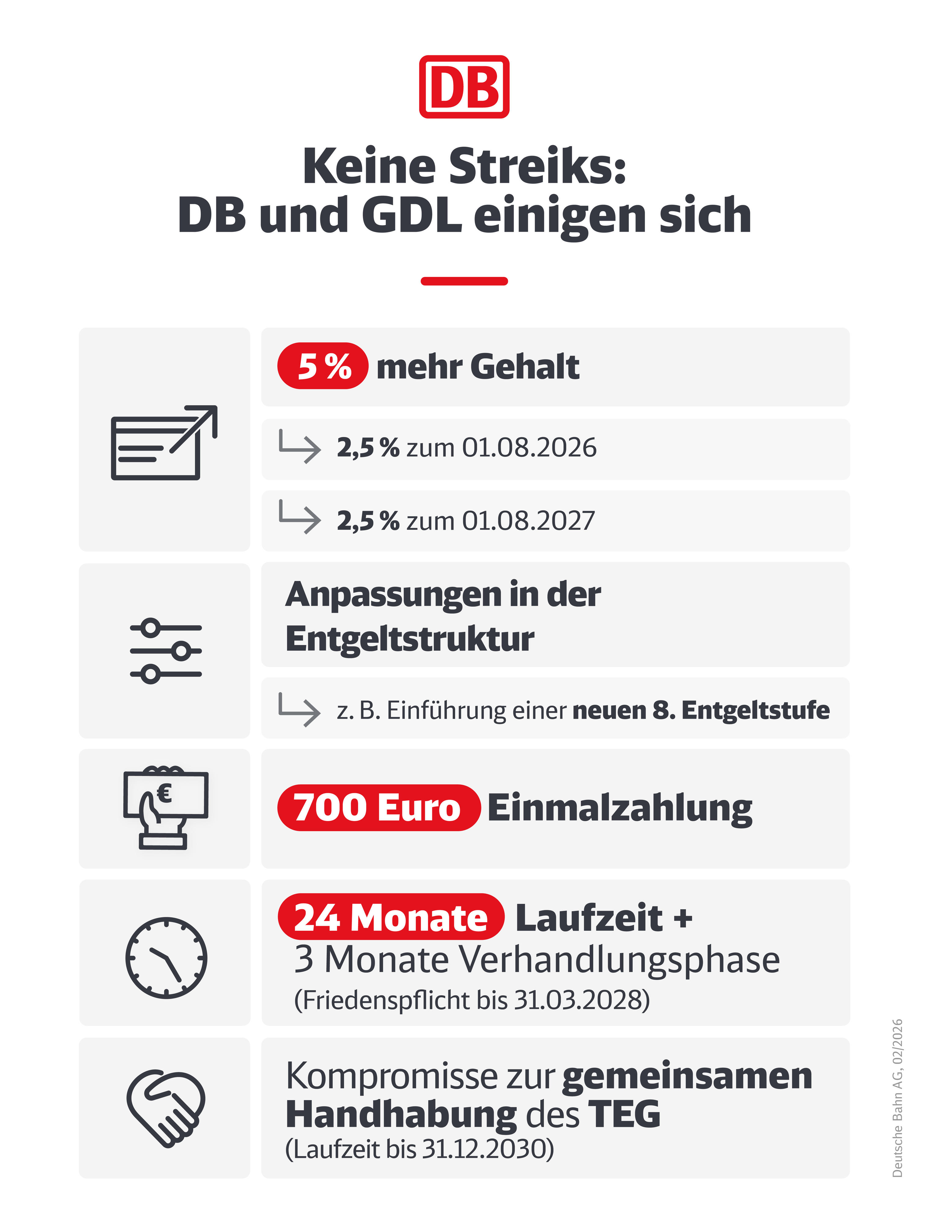 Gehälter steigen um 5 Prozent • zusätzliche Anpassungen in der Entgeltstruktur • Einführung einer neuen, achten Entgeltstufe • 700 Euro Einmalzahlung • 24 Monate Laufzeit • Kompromisse zur gemeinsamen Handhabung des Tarifeinheitsgesetzes • DB‑Personalvorstand Martin Seiler: „Faires und tragfähiges Ergebnis“