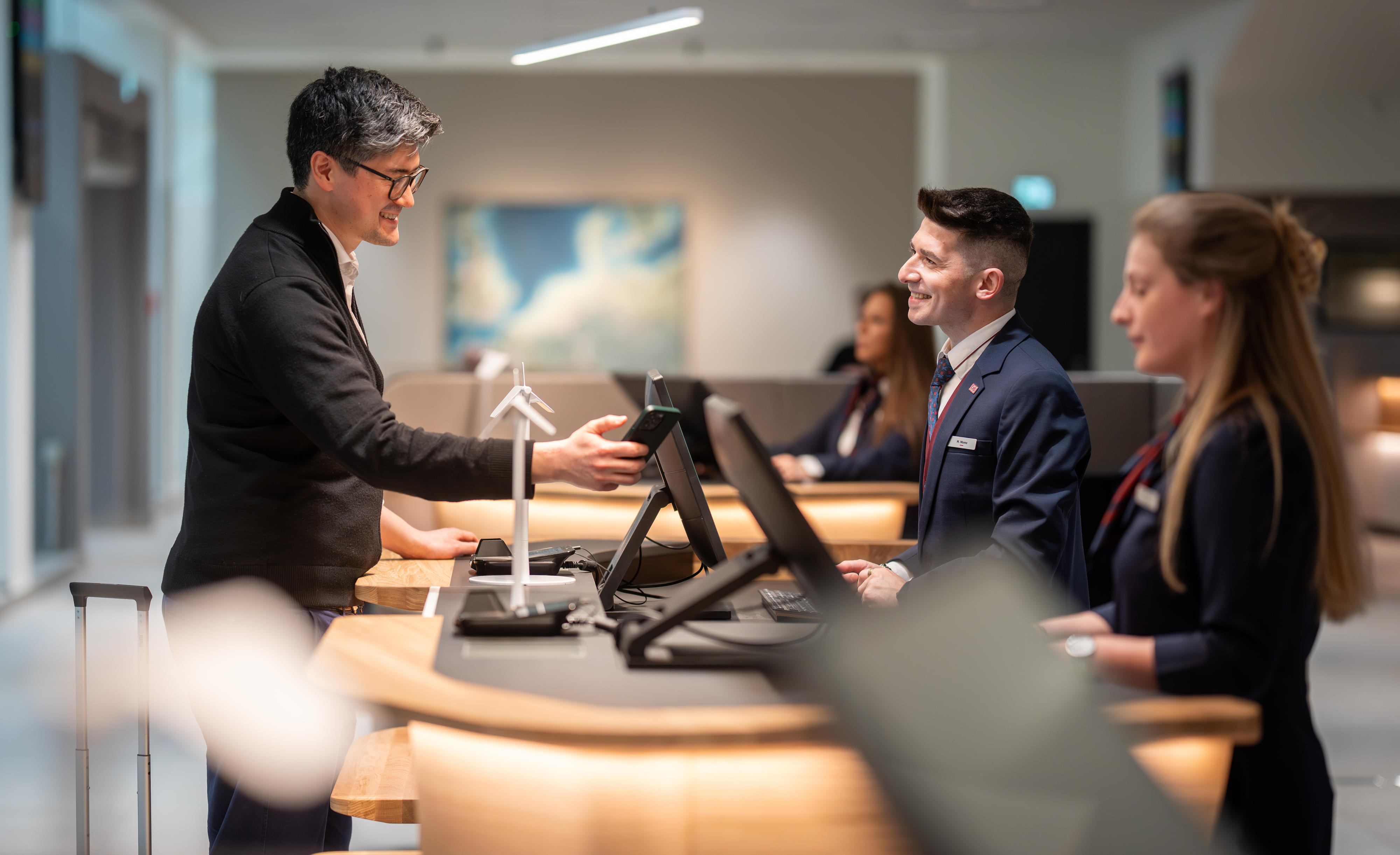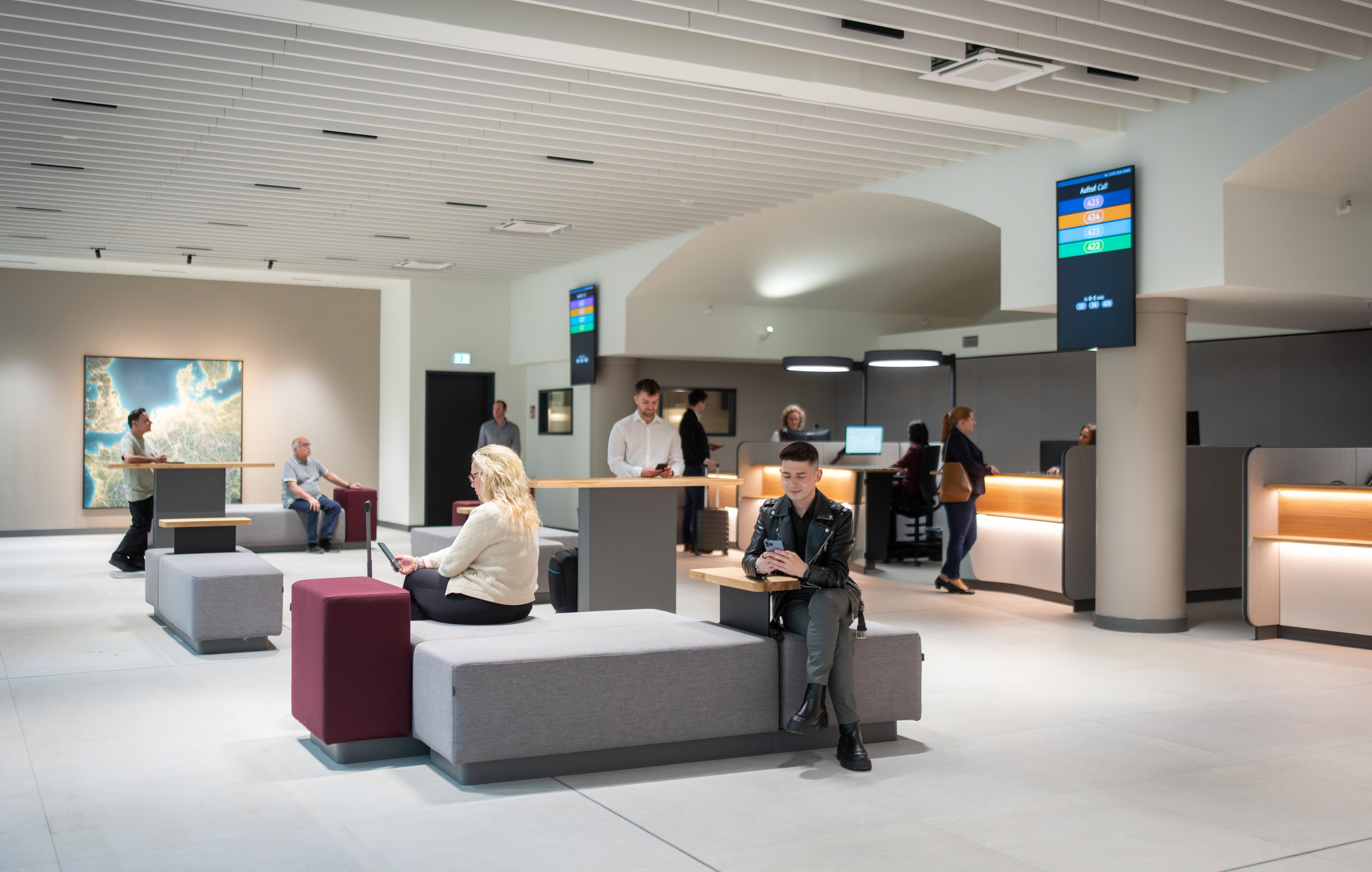 - einen großen Empfangsbereich mit vier Schaltern, an denen einfache Serviceanfragen ohne lange Wartezeit direkt geklärt werden können