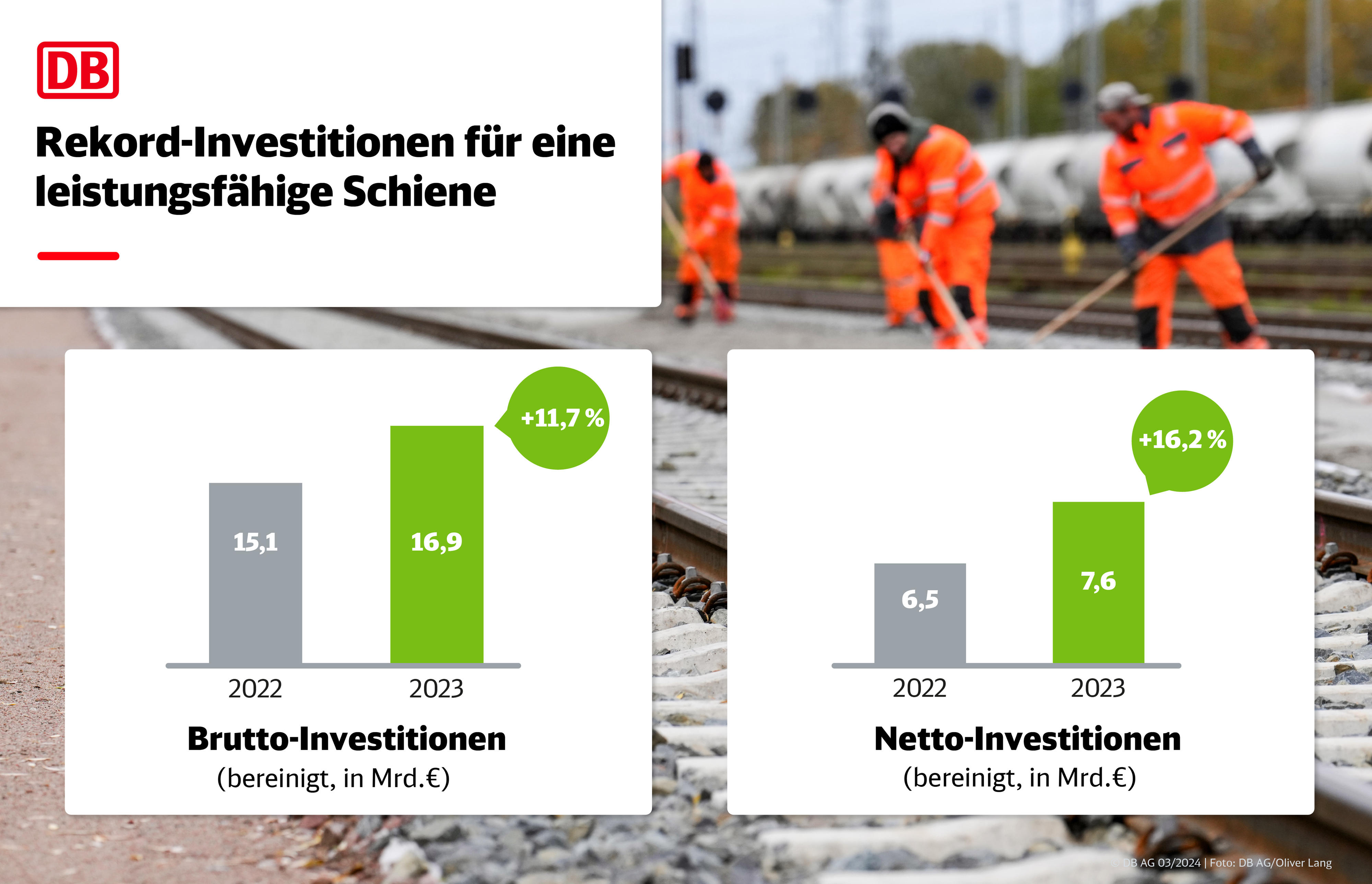 Die Brutto-Investitionen gemeinsam mit dem Bund sollen auf etwa 21 Milliarden Euro weiter steigen. Seine Netto-Investitionen aus Eigenmitteln will der DB-Konzern 2024 ebenfalls erneut deutlich anheben. Im Fernverkehr erwartet der DB-Konzern eine Pünktlichkeit von ungefähr 70 Prozent für dieses Jahr, bei DB Regio (Schiene) wird eine Pünktlichkeit von ungefähr 93 Prozent vorausgesagt.
