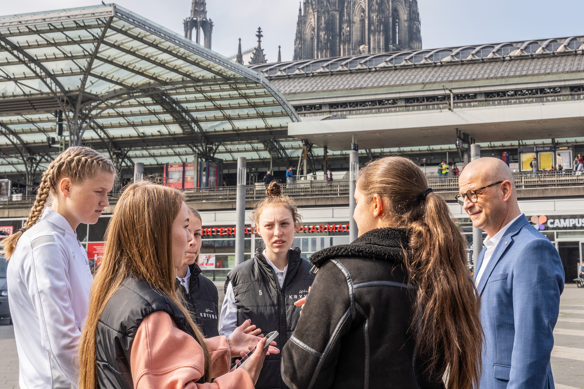 Die Deutsche Bahn, die Bundesagentur für Arbeit und die Stiftung des 1. FC Köln begrüßen im DB-Berufsberatungszentrum am Kölner Hauptbahnhof ukrainische Geflüchtete.