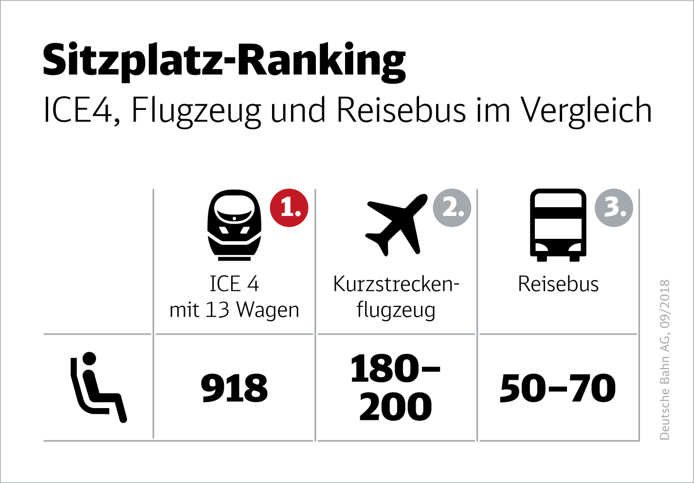 Der ICE 4 wurde von Siemens komplett neu konstruiert. Dabei hat ein 12-teiliger Zug sechs, ein 13-Teiler sieben angetriebene Wagen („Powercars“). Diese verfügen jeweils über von anderen Wagen unabhängige Motoren, die unterhalb des Wagenkastens angeordnet sind. Weil damit auch in den Endwagen Raum für Fahrgäste ist, können im ICE 4 besonders viele Sitzplätze angeboten werden: 830 im zwölfteiligen, 918 Sitzplätze im dreizehnteiligen ICE 4, dem „XXL-ICE“. Das sind rund fünfmal mehr als in einem Mittelstreckenflugzeug und rund 15-mal mehr als in einem Fernreisebus. Die um rund zwei Meter längeren Einzelwagen machen den ICE 4 zu einem Nutzflächenweltmeister – bei gleichbleibender Beinfreiheit. Die Sitzplätze verteilen sich auf 205 in der 1. und 625 (bzw. 713) Plätze in der 2. Klasse. Das zusätzliche Powercar lässt den 13-Teiler noch besser beschleunigen. Die Höchstgeschwindigkeit der 12-und 13-teiligen ICE 4 liegt bei 265 km/h.
