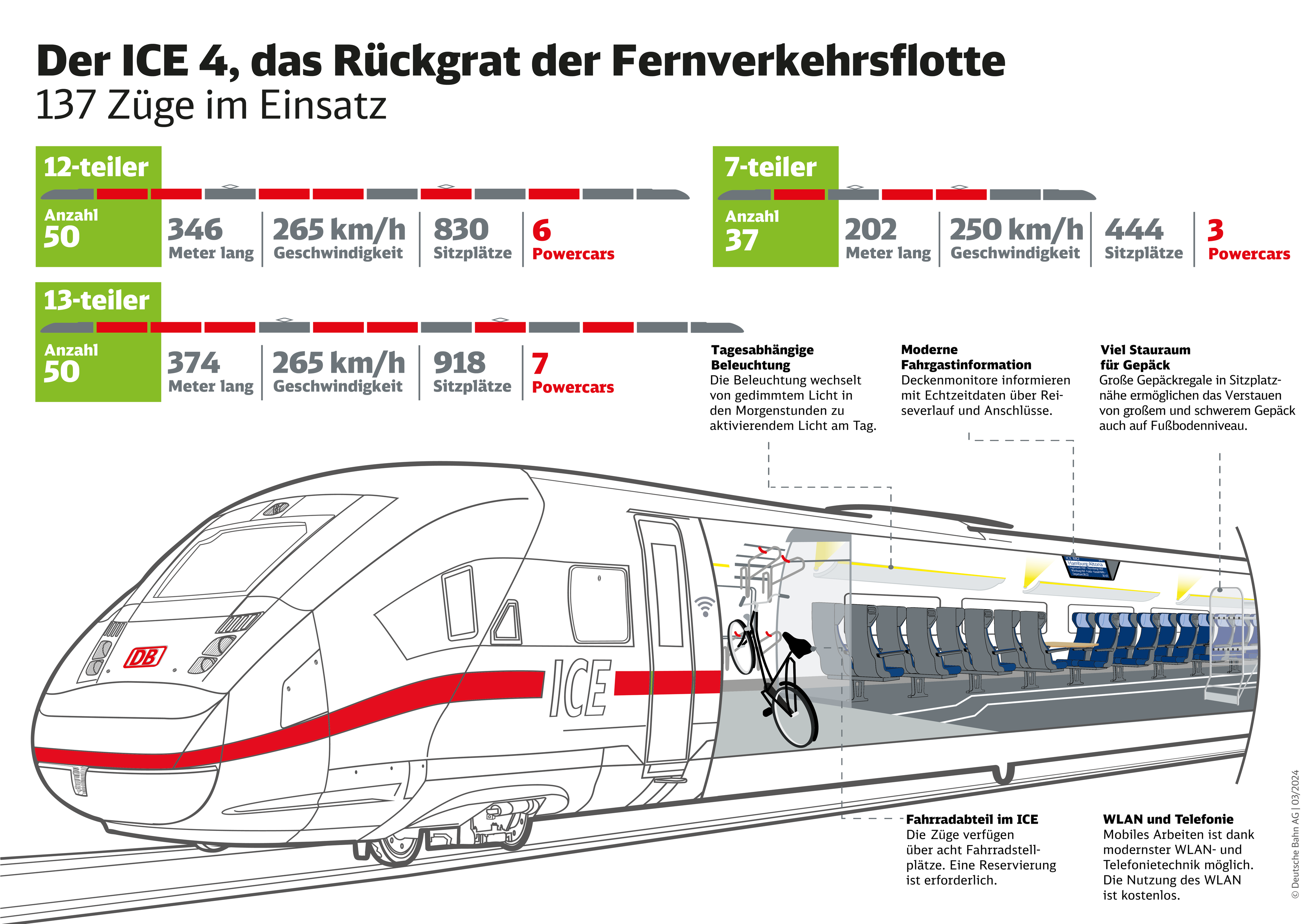- 37 Züge mit 7 Wagen, die unter anderem zwischen Berlin und Nordrhein-Westfalen fahren. Zwei dieser ICE können zudem zu einer 14 Wagen umfassenden sogenannten Doppeltraktion gekuppelt werden.